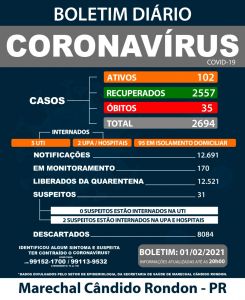 Marechal Cândido Rondon começou o mês de fevereiro com 2.694 casos confirmados de coronavírus. O número de casos ativos soma 102.