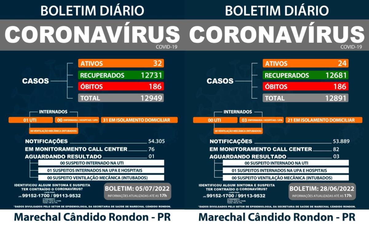 Compare os dois últimos boletins da Covid-19 em Marechal Rondon: