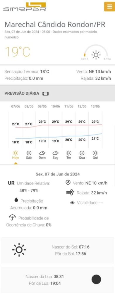 Confira a previsão do tempo para os demais dias em Marechal Rondon, segundo a Simepar: