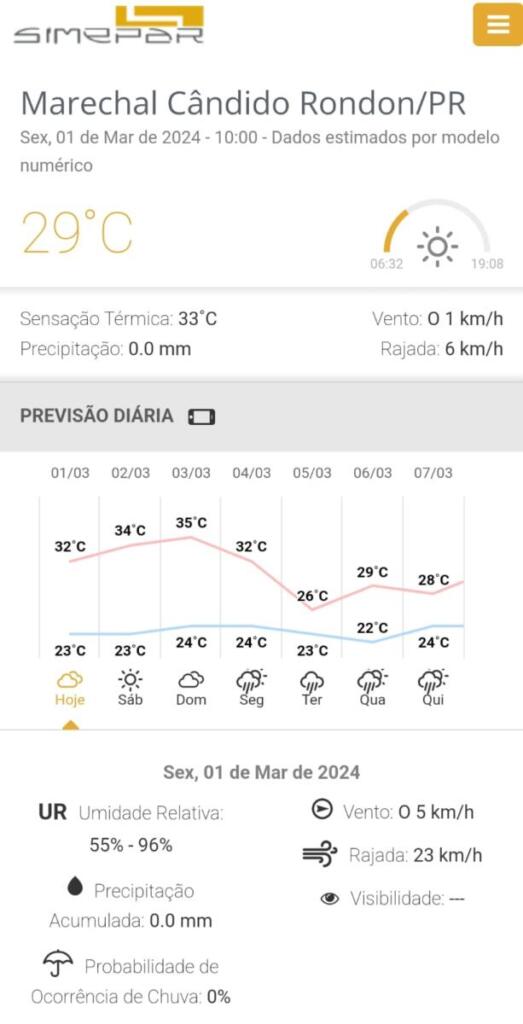 Para Marechal Rondon a máxima prevista para hoje é de 32°C e umidade do ar varia de 55% a 96%.