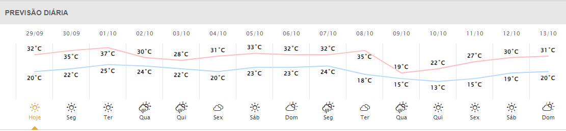 Em Cascavel, as temperaturas variam de 16°C a 29°C. Já em Toledo os termômetros oscilam dos 18°C aos 30°C. Foz do Iguaçu deve registrar 31°C à tarde. Em Guaíra (PR), as temperaturas variam dos 20°C aos 31°C.