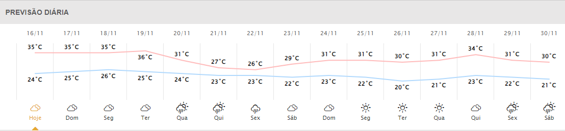 A máxima prevista para o município, hoje, de acordo com o Sistema de Tecnologia e Monitoramento Ambiental do Paraná (Simepar), é de 35ºC. As temperaturas seguem altas nos próximos dias, sendo que para terça-feira (19) há previsão de 36ºC. O Simepar aponta chuva para quarta e quinta-feira, sendo 4 e 11 milímetros, respectivamente.