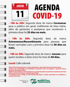 A vacinação contra a Covid-19 tem sequência em Marechal Cândido Rondon nesta terça-feira (11), segundo agenda divulgada pela Secretaria de Saúde. A aplicação das vacinas acontece no Café Colonial, das 16 às 20 horas.