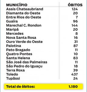 Segundo o último relatório divulgado no dia 10 de setembro pela Secretaria de Estado da Saúde (Sesa), os três municípios da 20ª Regional de Saúde – Toledo, que mais registraram óbitos foram Toledo, com 444 mortes, seguido de Marechal Rondon, com 144 casos, e Assis Chateaubriand, com 124 falecimentos.