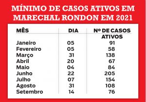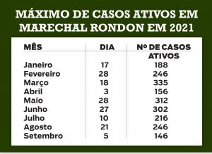 Junho foi o mês que apresentou o maior índice de óbitos este ano por Covid-19 em Marechal Rondon, com 20 casos, seguido de março com 18 mortes e agosto com 13 falecimentos. Janeiro foi o mês com menor número de fatalidades, com dois casos. Considerando os óbitos ocorridos no município até ontem, a média é de 12 mortes por mês.
