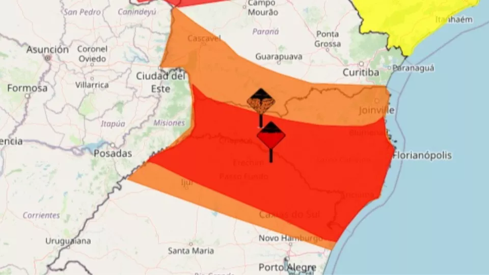 O alerta prevê chuva entre 30 e 60 mm/h ou 50 e 100 mm/dia, ventos intensos (60-100 km/h), e queda de granizo. Risco de corte de energia elétrica, estragos em plantações, queda de árvores e de alagamentos.