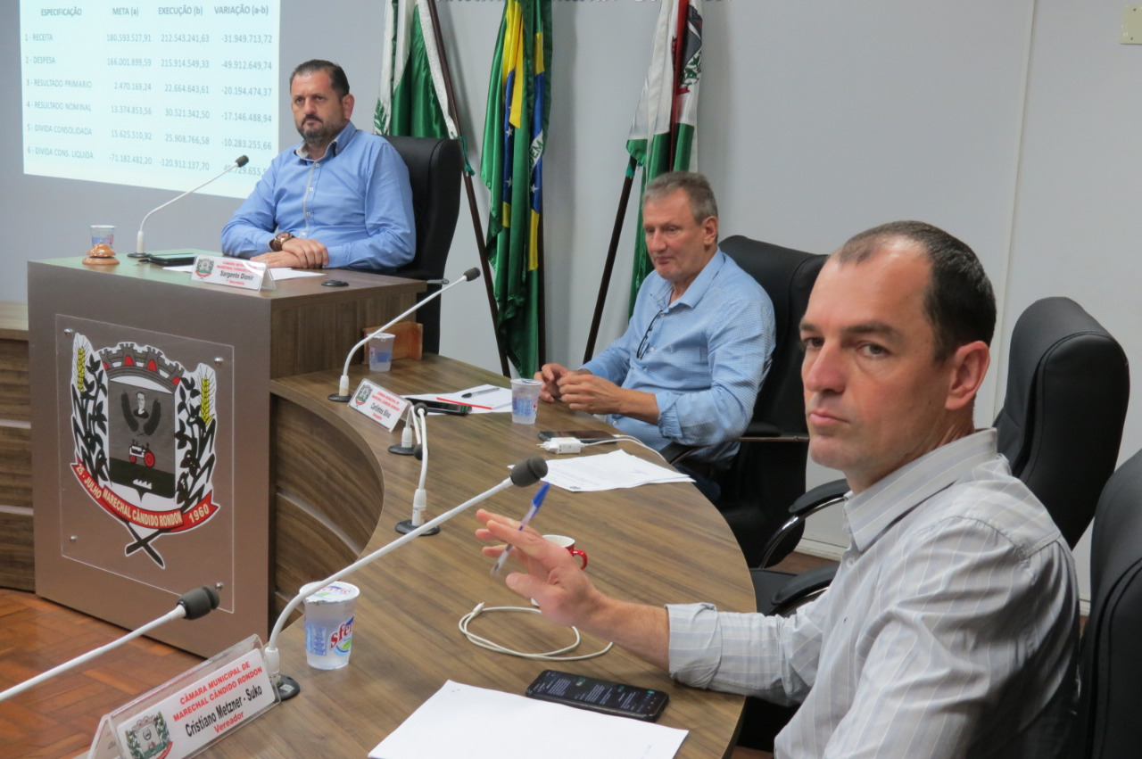 A Câmara de Vereadores de Marechal Cândido Rondon realizou, na tarde de quarta-feira (28), audiência pública de prestação de contas da Secretaria Municipal da Fazenda, relativas ao segundo quadrimestre de 2022. Estiveram presentes os vereadores Carlinhos Silva, Cristiano Metzner (Suko) e Dionir Briesch (Sargento Dionir), que presidiu a audiência.
