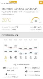 A previsão aponta chuva para Marechal Cândido Rondon até quarta-feira (13). Depois, haverá uma sequência de dias de tempo bom, com céu limpo e sol.