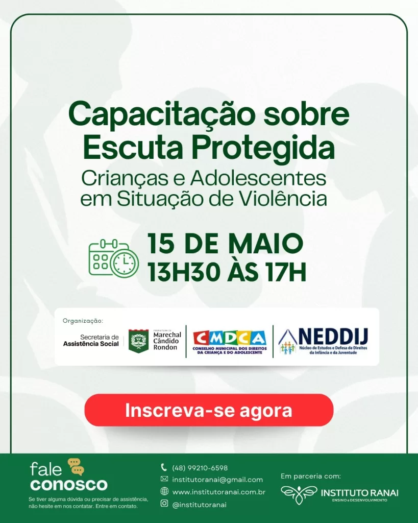 Em alusão ao 18 de maio, a Secretaria de Assistência Social de Marechal Cândido Rondon, em parceria com o Conselho Municipal dos Direitos da Criança e do Adolescente (CMDCA) e o Núcleo de Estudo e Defesa dos Direitos da Infância e Juventude (NEDDIJ), promoverá, no dia 15 de maio, uma capacitação sobre “Escuta Protegida de Crianças e Adolescentes em Situação de Violência”. O evento será realizado na sala do Tribunal do Júri da Unioeste e contará com a presença do psicólogo e professor Rudinei Luiz Beltrame.
