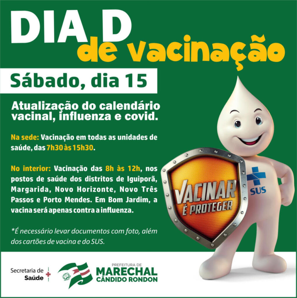 A Secretaria de Saúde de Marechal Cândido Rondon promove neste sábado (15), o Dia “D” de vacinação contra a influenza e a Covid-19, além de atualizar o calendário vacinal. É necessário levar um documento pessoal com foto, além dos cartões de vacina e do SUS.
