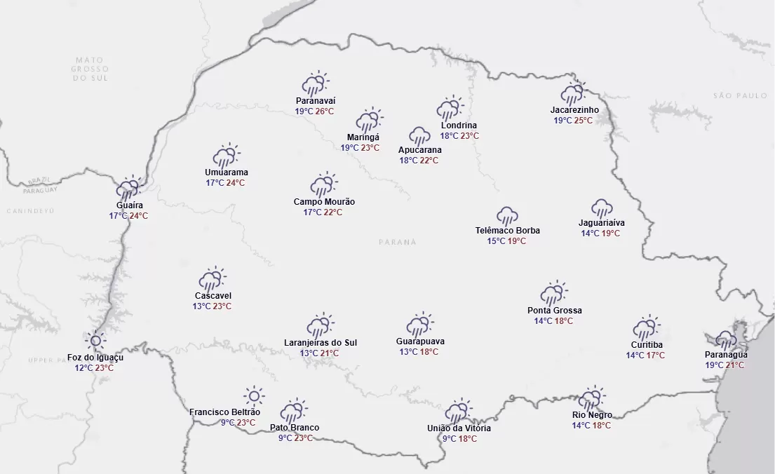 De acordo com os meteorologistas, são esperadas pancadas de chuva isoladas, acompanhadas de descargas elétricas ao longo do dia, com possibilidade de tempestades mais intensas — especialmente nas regiões Noroeste, Norte, Campos Gerais e Leste.