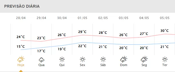 Em Cascavel amanheceu com sensação térmica de 10°C, com previsão de 23°C, com possibilidade de chuva fraca e precipitação acumulada de cerca de 2 milímetros.