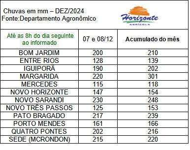 Veja os acumulados de chuva registrados pela Agrícola Horizonte: