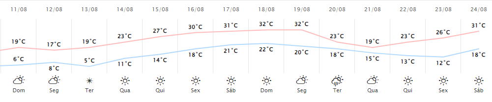 O Simepar aponta baixas temperaturas para os próximos dias. Somente na sexta-feira os termômetros devem registrar máxima de 30ºC. Há previsão de geada para terça-feira e mínima de 5ºC.