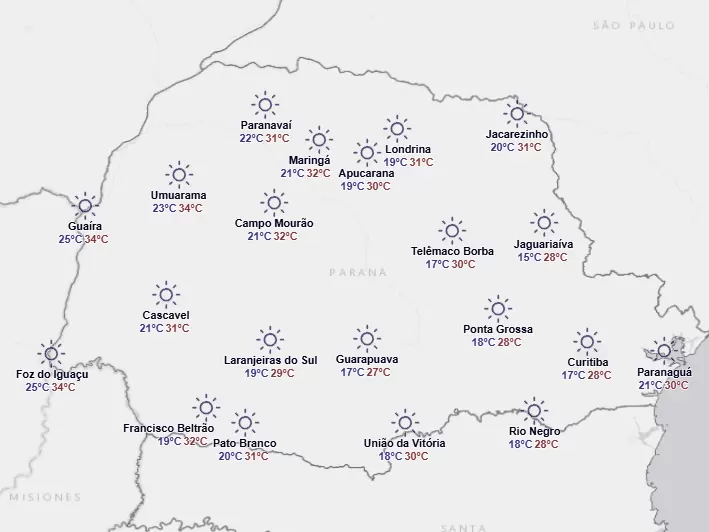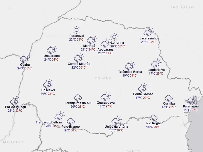 Final de semana tem previsão de chuva para praticamente todo o Estado. O sábado (7) amanhece com tempo estável em todo o Paraná. Entre o final da manhã e a tarde, o avanço de um cavado meteorológico em direção ao estado, com deslocamento de sudoeste para nordeste, promove gradualmente o retorno das instabilidades para as regiões paranaenses. Há risco elevado para ocorrência de tempestades em toda metade sul do estado. Faz bastante calor em todas as regiões ultrapassando a marca dos 30°C.