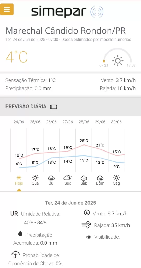 Previsão do tempo para Marechal Rondon nos próximos dias, conforme o Simepar: