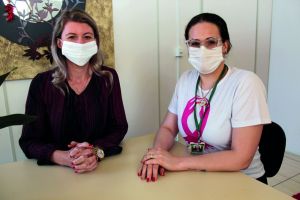 Secretária de Saúde de Marechal Rondon, Marciane Specht, com a coordenadora da Atenção Primária em Saúde, Raquel Rech: “Percebemos uma redução de óbitos por algum tipo de câncer em Marechal Rondon” (Foto: Raquel Ratajczyk/OP)
