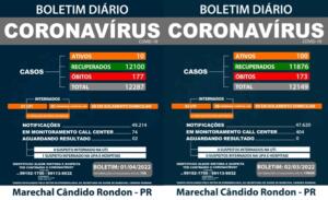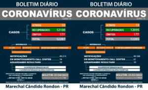 O Setor de Epidemiologia da Secretaria de Saúde atualizou as informações sobre a Covid-19 em Marechal Cândido Rondon nesta sexta-feira (1º). Conforme o boletim, abril começa com 12.287 diagnósticos positivos de coronavírus (dois confirmados nas últimas 24 horas), sendo 12,1 mil rondonenses recuperados e 177 óbitos devido à doença.