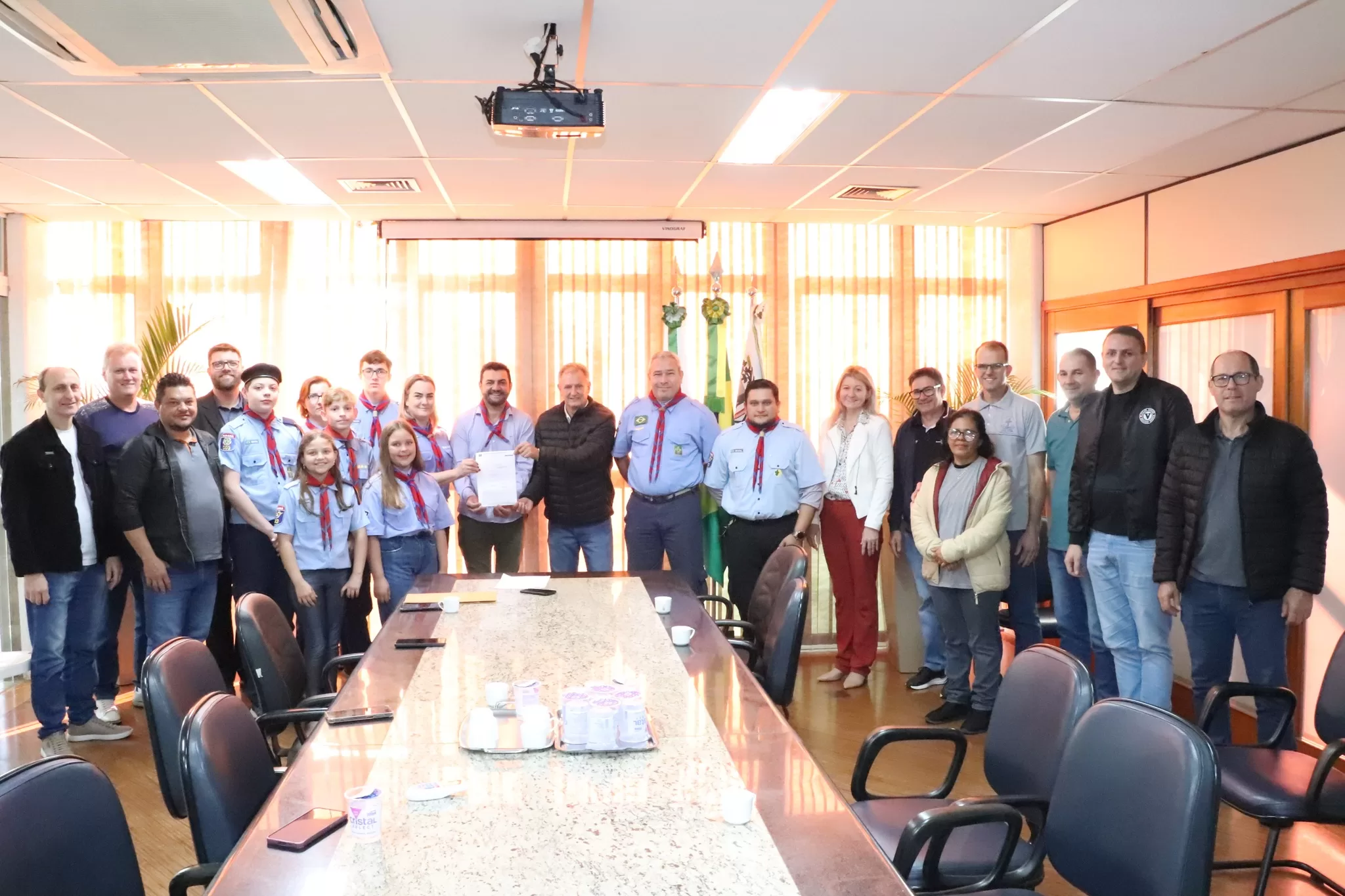 Representantes do Grupo Escoteiro Harpia, acompanhados do pastor Heber Fach e de membros da diretoria da Igreja Luterana Cristo é Vida, estiveram na prefeitura de Marechal Cândido Rondon na manhã desta quarta-feira (9).