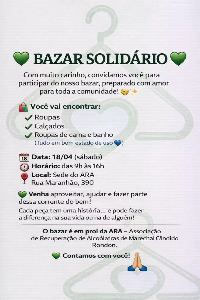 A Associação de Recuperação de Alcoólatras (ARA) de Marechal Cândido Rondon promove, neste sábado (18), um bazar solidário com o objetivo de arrecadar recursos para a manutenção de suas atividades.