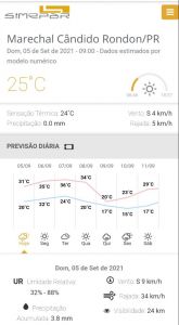 Confira a previsão do tempo para os próximos dias em Marechal Rondon, segundo o Simepar: