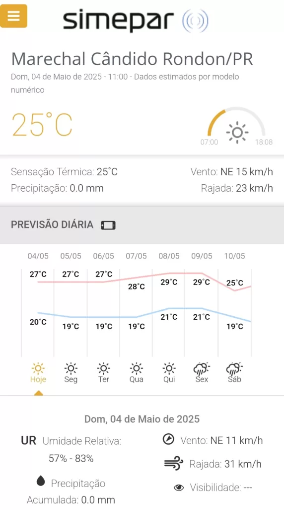 Previsão para Marechal Rondon, segundo o Simepar: