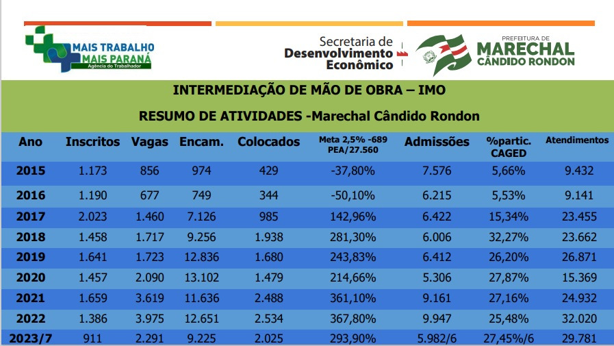 Segundo ele, é importante destacar que a agência do trabalhador de Marechal Rondon tem apresentado um histórico de sucesso nessa área. “No mês de maio, alcançamos a 4ª colocação, em junho a 5ª, e agora, em julho, conquistamos a 3ª posição em colocação de trabalhadores no mercado. No ano passado já batemos um recorde histórico ao intermediar a assinatura de 2.534 carteiras de trabalho. Neste ano alcançamos o número expressivo de 2.025 contratações intermediadas até julho, o que representa 293,90% da meta estabelecida pelo Ministério do Trabalho para 2023”, salientou.