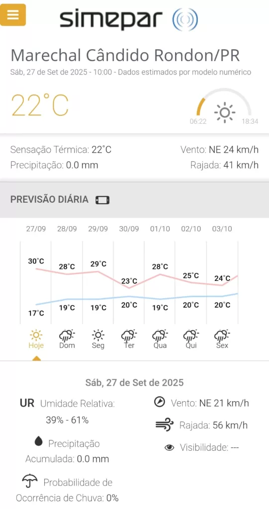 Marechal Cândido Rondon amanheceu com 17ºC neste sábado (27). Cascavel registrou sensação térmica de 10°C, a previsão para hoje é de máxima de 27°C. Em Toledo, o dia começou com 14°C e deve esquentar também, chegando aos 28°C.