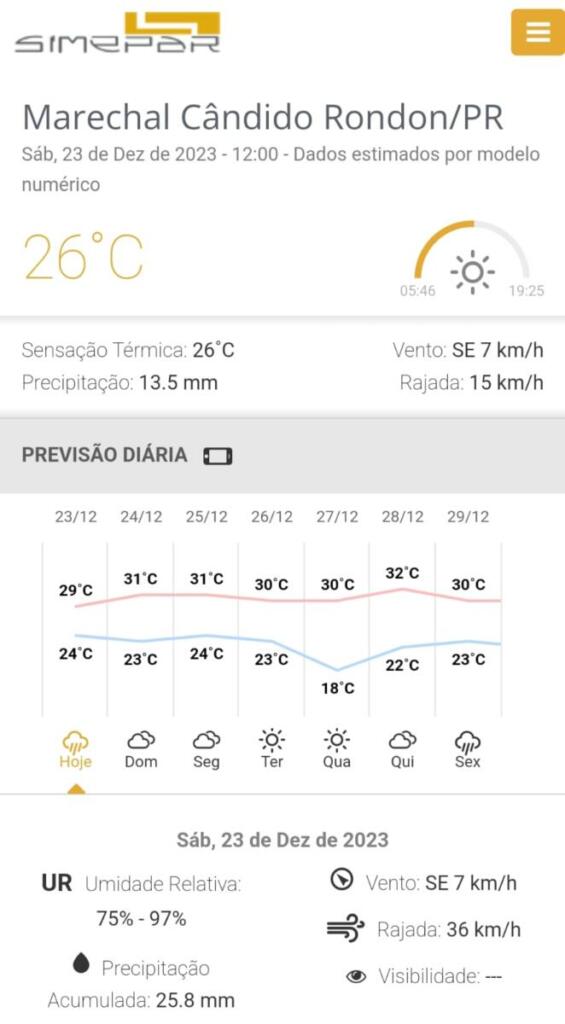 O sábado (23) começou quente e abafado em Marechal Cândido Rondon. A máxima prevista para hoje é de 29ºC, conforme o Simepar. No entanto, outros institutos de meteorologia apontam para 32ºC. A sensação térmica é bem maior do que marcam os termômetros. Há previsão de chuva.