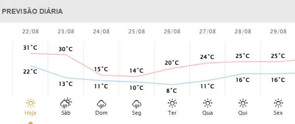 Em Toledo as temperaturas variam de 21°C a 29°C, as rajadas de ventos podem atingir 71km/h e a umidade do ar fica entre 46% e 78%.