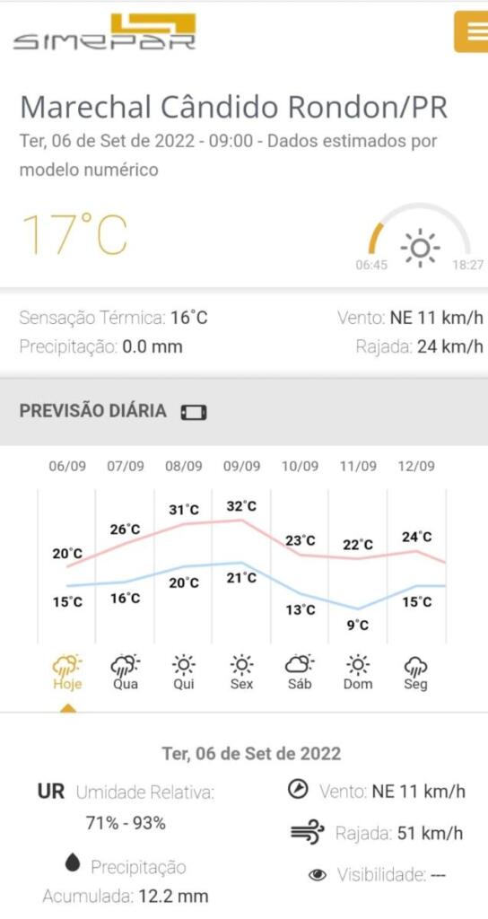 Confira a previsão do tempo para os próximos dias em Marechal Rondon, conforme o Simepar: