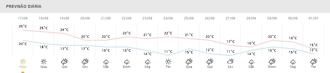 Foz do Iguaçu terá temperaturas variando de 21°C a 25°Cm ventos de até 62km/h e umidade do ar entre 64% e 78%.