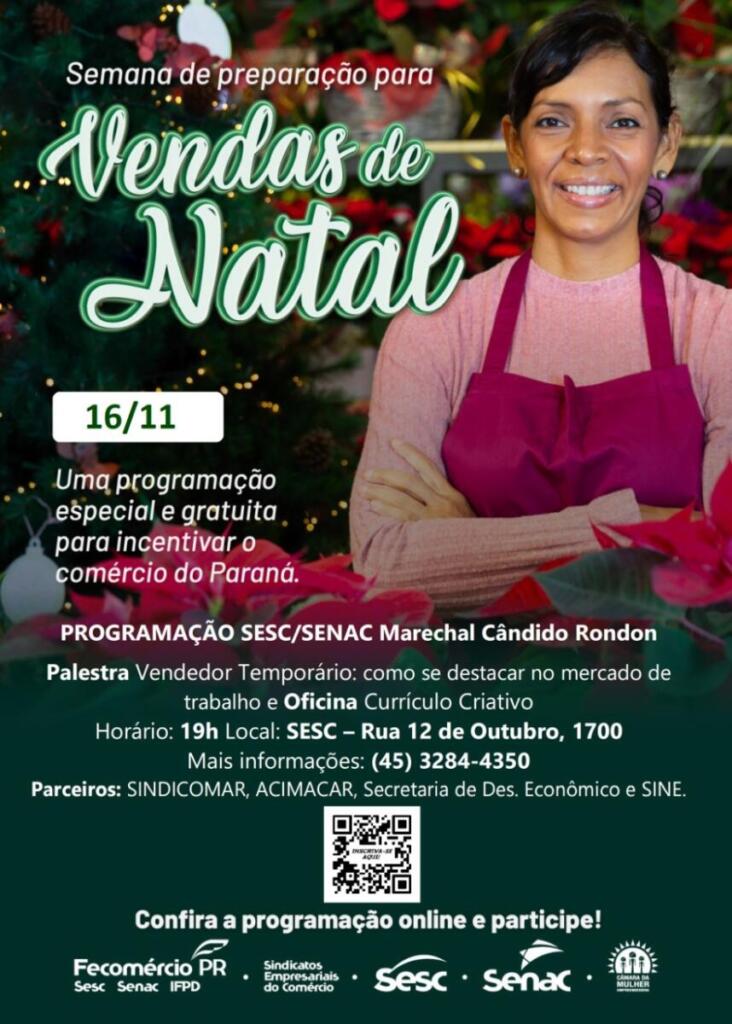 O Sesc, Senac, Sindicomar e Câmara da Mulher realizam na próxima semana – quarta-feira, dia 16 de novembro, às 19 horas, no Sesc de Marechal Cândido Rondon, em parceria com o Sine, Acimacar e Secretaria de Desenvolvimento Econômico Municipal, a “Ação de preparação de vendas para o Natal 2022”.