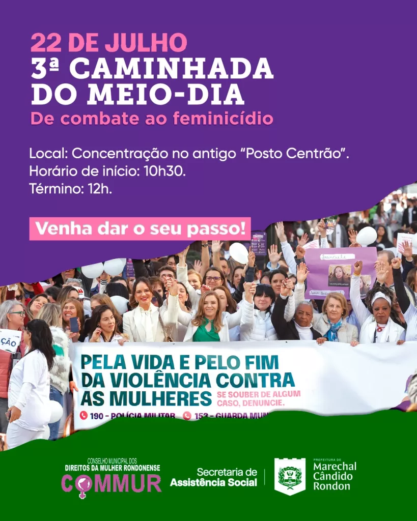 Nesta terça-feira (22), Marechal Cândido Rondon realizará a Caminhada do Meio-Dia, promovida pela prefeitura, por meio da Secretaria de Assistência Social, em parceria com o Conselho dos Direitos da Mulher Rondonense (Commur). A ação é alusiva ao Dia Estadual de Combate ao Feminicídio e integra a campanha Paraná Unido no Combate ao Feminicídio, que mobiliza diversos municípios do estado.