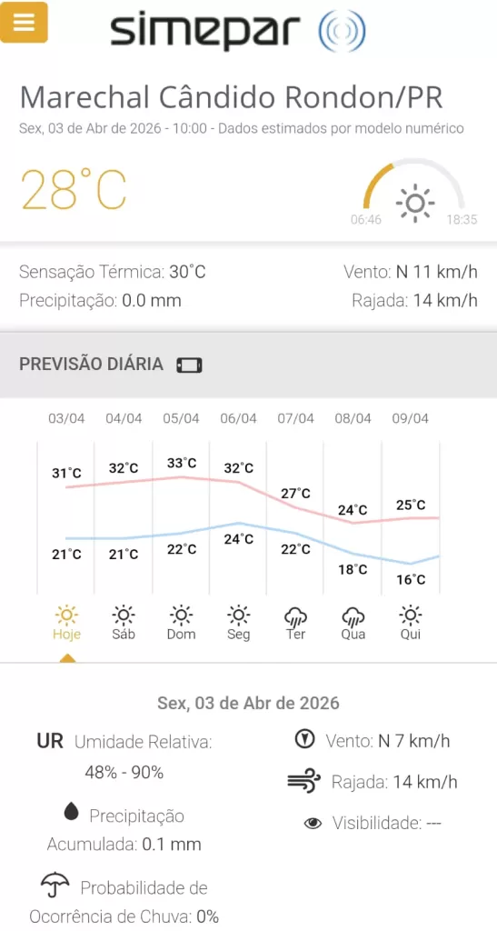 Veja a previsão do Simepar para Marechal Rondon: