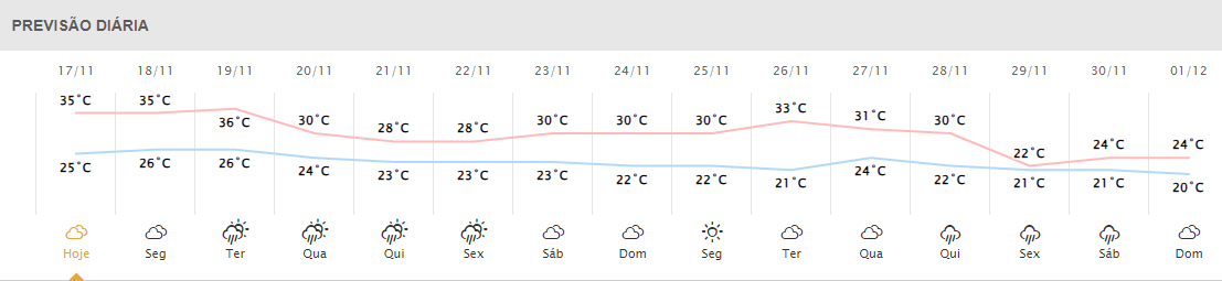 A máxima prevista para hoje é de 35°C e rajadas de ventos de 43km/h.