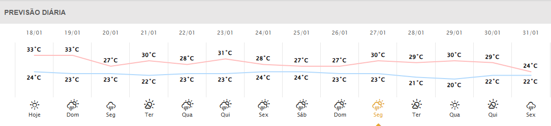 Já o domingo (19) tem previsão de instabilidade. Pode chover a qualquer hora do dia, embora entre a tarde e noite aumentem os pontos de chuva na região. Em relação às temperaturas, ficam em média mais amenas, por conta de uma maior presença de nebulosidade. Setores do oeste, próximo ao Paraguai e Mato Grosso do Sul, devem ser as áreas mais aquecidas até tarde, acima dos 30°C, enquanto na maior parte do estado, é esperado valores menos elevados, abaixo dos 30°C.