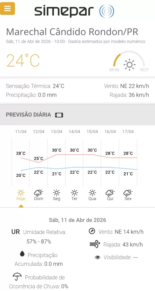 O clima em Marechal Cândido Rondon neste fim de semana será marcado por contrastes. O sábado (11) promete ser de sol forte e temperaturas elevadas, ideal para atividades ao ar livre. Já o domingo (12) deve trazer chuvas intensas e risco de tempestade, exigindo atenção da população.