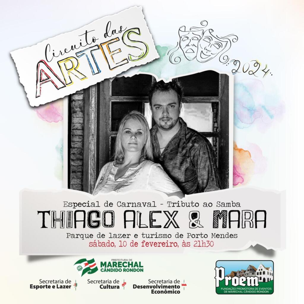 No dia 10 de fevereiro, haverá aula de zumba das 18 às 19 horas, seguida de apresentação da dupla Thiago Alex e Mara, das 21h30 à 1h30, no parque de lazer e turismo de Porto Mendes.