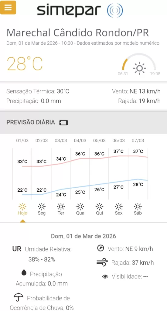 O domingo (1º de março) será de sol forte e calor intenso em Marechal Cândido Rondon. As temperaturas variam entre 21°C e 34°C, com baixa chance de chuva (18%). A umidade relativa do ar oscila de 37% a 79%, e os ventos sopram moderados, em torno de 12 km/h. O dia promete ser típico de verão, com sensação de abafamento e índice UV extremo, exigindo cuidados com exposição solar