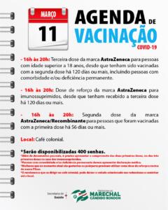 A Secretaria de Saúde segue com o cronograma de vacinação contra a Covid-19 nesta sexta-feira (11) em Marechal Cândido Rondon. A aplicação das vacinas acontece no Café Colonial, das 16 às 20 horas. Conforme a programação, há 400 senhas disponíveis.