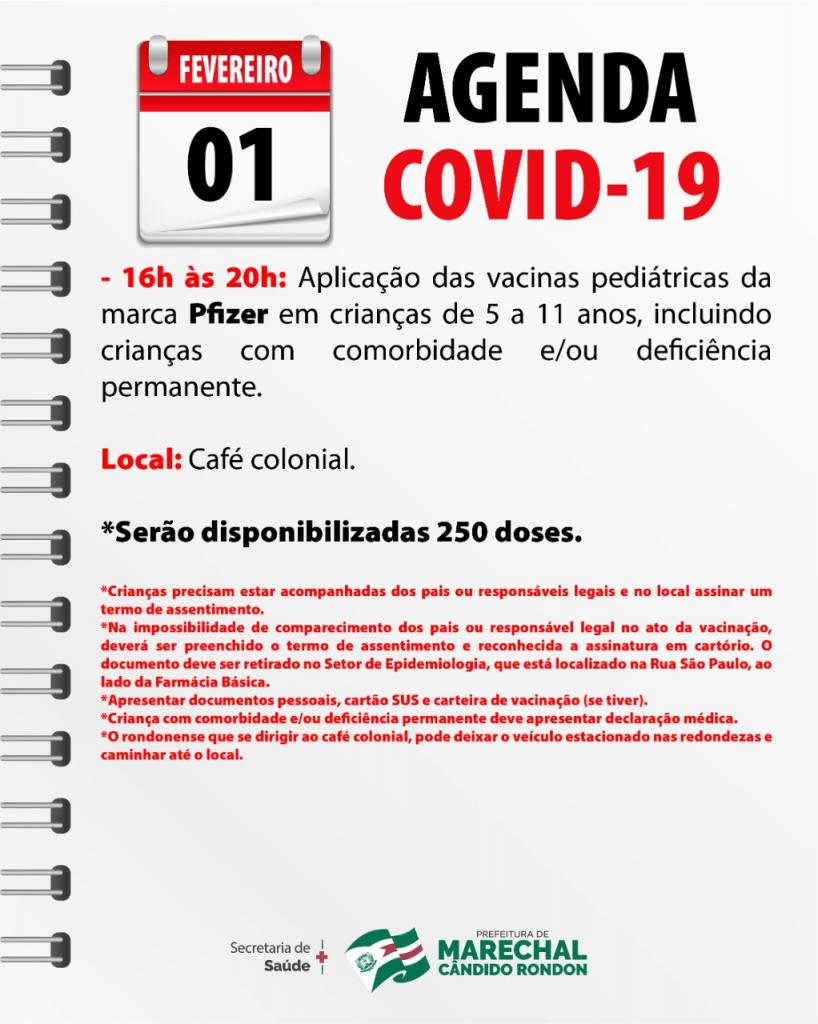 A Secretaria de Saúde de Marechal Cândido Rondon disponibiliza vacinas pediátricas da Pfizer nesta terça-feira (1º). A imunização ocorre no Café Colonial, das 16 às 20 horas; 250 doses serão disponibilizadas.