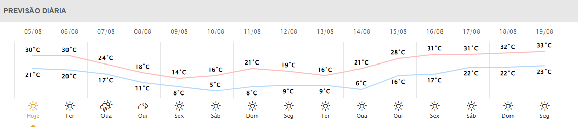 Confira a previsão do tempo para os próximos dias em Marechal Rondon, conforme o Simepar: