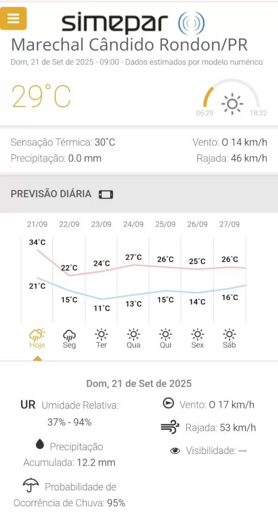 Marechal Cândido Rondon amanheceu com 21°C neste domingo (21) e a máxima prevista para o dia é de 34ºC. Segundo o Simepar, há previsão de 12 milímetros de chuva.