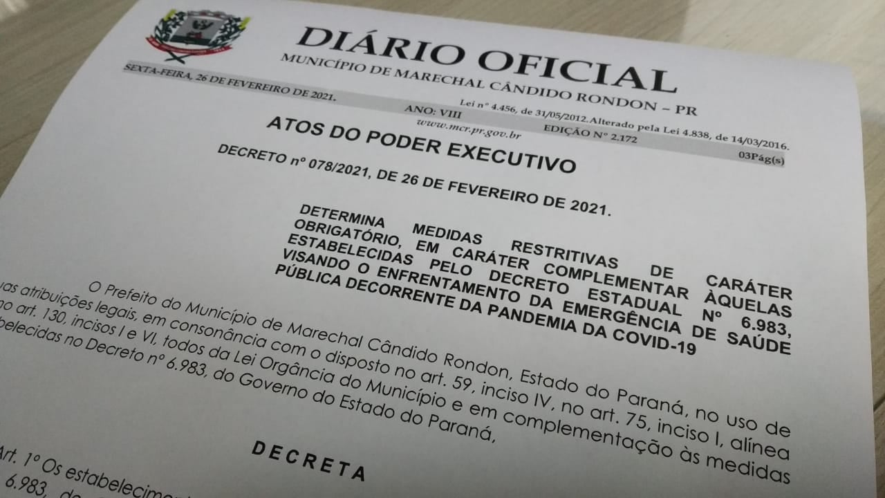 O Prefeito do Município de Marechal Cândido Rondon, Estado do Paraná, no uso de suas atribuições legais, em consonância com o disposto no art. 59, inciso IV, no art. 75, inciso I, alínea o, no art. 130, incisos I e VI, todos da Lei Orgância do Município e em complementação às medidas estabelecidas no Decreto nº 6.983, do Governo do Estado do Paraná,
