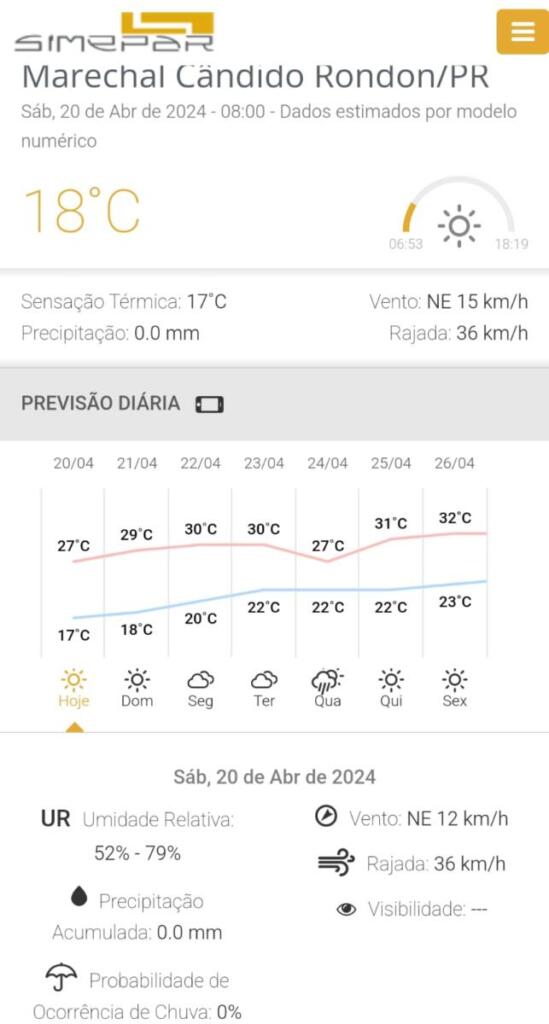 O sábado (20) amanheceu com céu limpo e temperaturas na casa dos 17ºC, logo nas primeiras horas do dia, em Marechal Cândido Rondon.