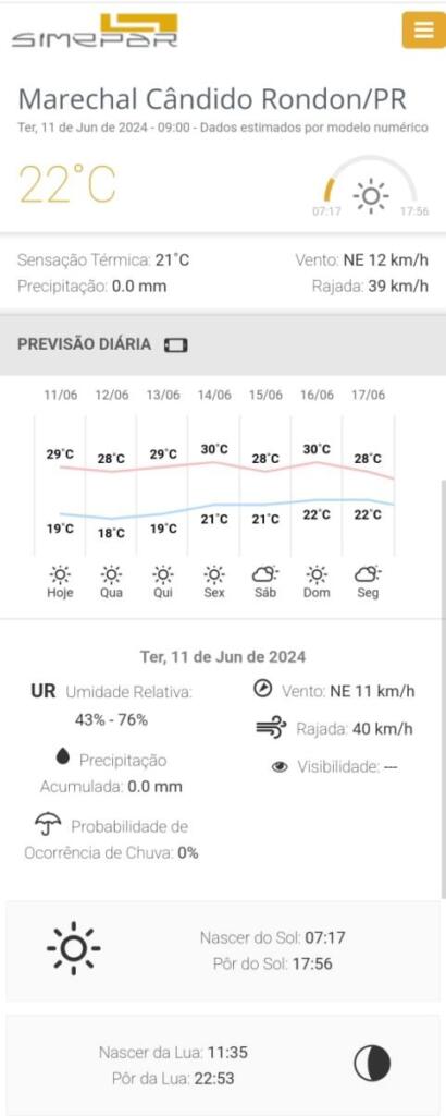 Veja a previsão para os próximos dias em Marechal Rondon, de acordo com a Simepar: