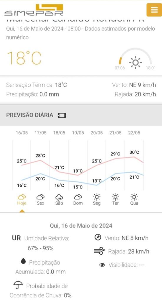 Marechal Cândido Rondon amanheceu nesta quinta-feira (16) com temperaturas mais altas em relação aos últimos dias. Por volta das 7 horas, os termômetros marcavam 17ºC. Conforme a previsão do Simepar, o tempo deve seguir estável ao longo do dia. A máxima prevista é de 25ºC.