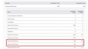 Conforme consta nos relatórios, na faixa etária acima de 90 anos 114 pessoas foram imunizadas na primeira dose e 112 receberam o reforço, ou seja, apenas duas pessoas ainda não receberam a segunda dose. Já da faixa etária de 85 a 89, 348 pessoas receberam a primeira dose e apenas 66 a segunda. Já de 80 a 84 anos, 648 receberam a primeira dose e 335 a segunda. Portanto, na faixa etária de 80 a 89 anos 996 pessoas receberam a primeira dose e apenas 401 a segunda, o que corresponde a 40%. Segundo o setor de epidemiologia, da Secretaria de Saúde, 100% das pessoas nesta faixa etária já deveriam ter recebido a segunda dose. Por isso os dados são preocupantes.