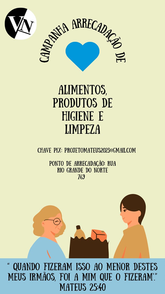 Os jovens do Ministério Vida Nova, da Igreja Assembleia de Deus, templo sede, integrantes do Projeto Mateus, estão realizando uma campanha de arrecadação de alimentos não perecíveis e materiais de higiene e limpeza com a finalidade de ajudar famílias carentes rondonenses.